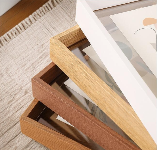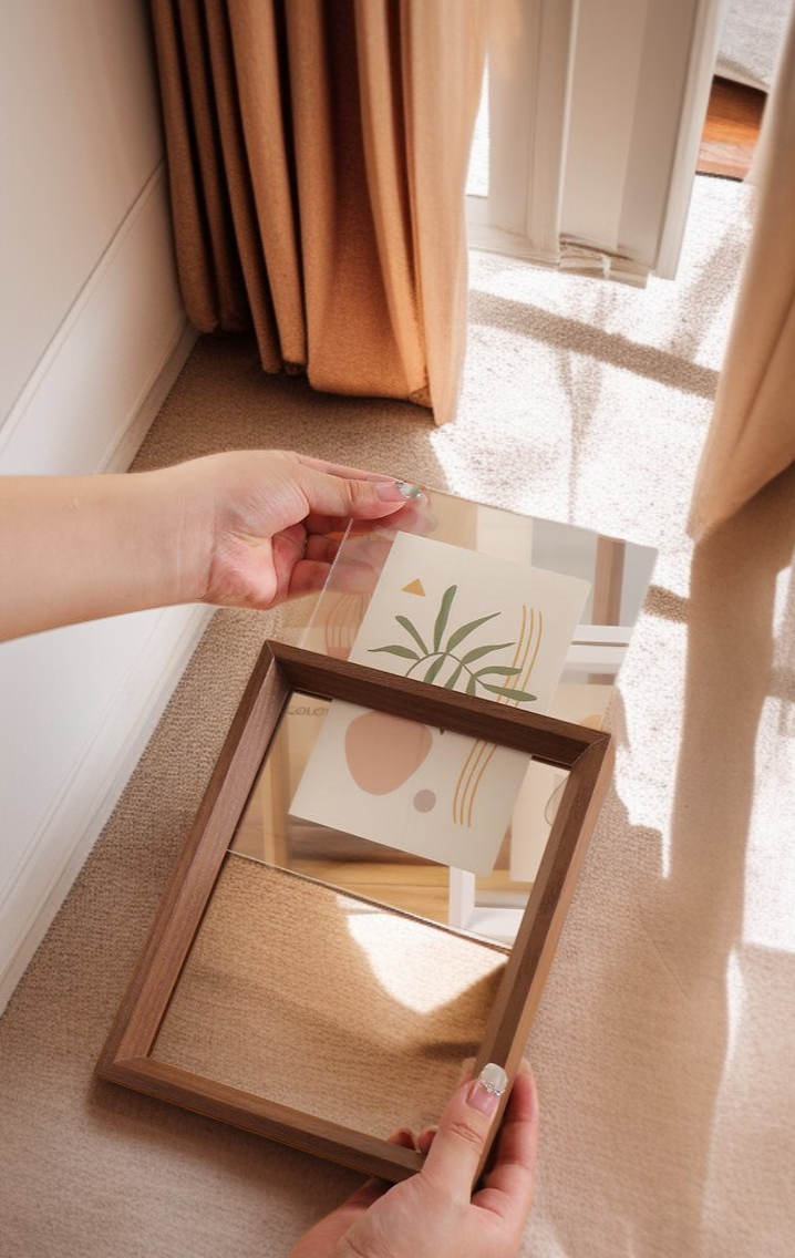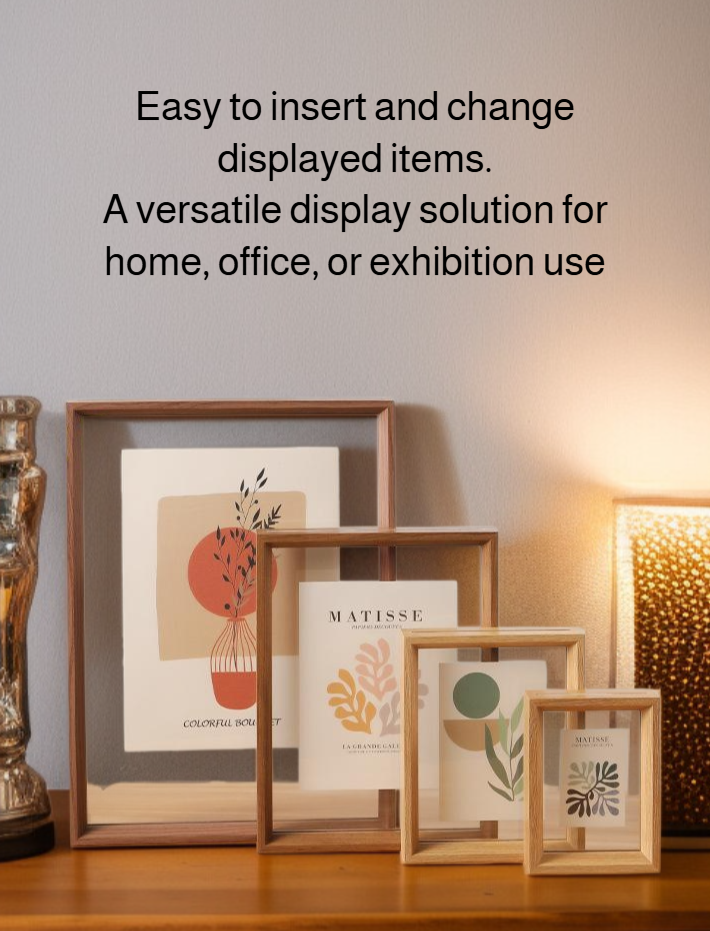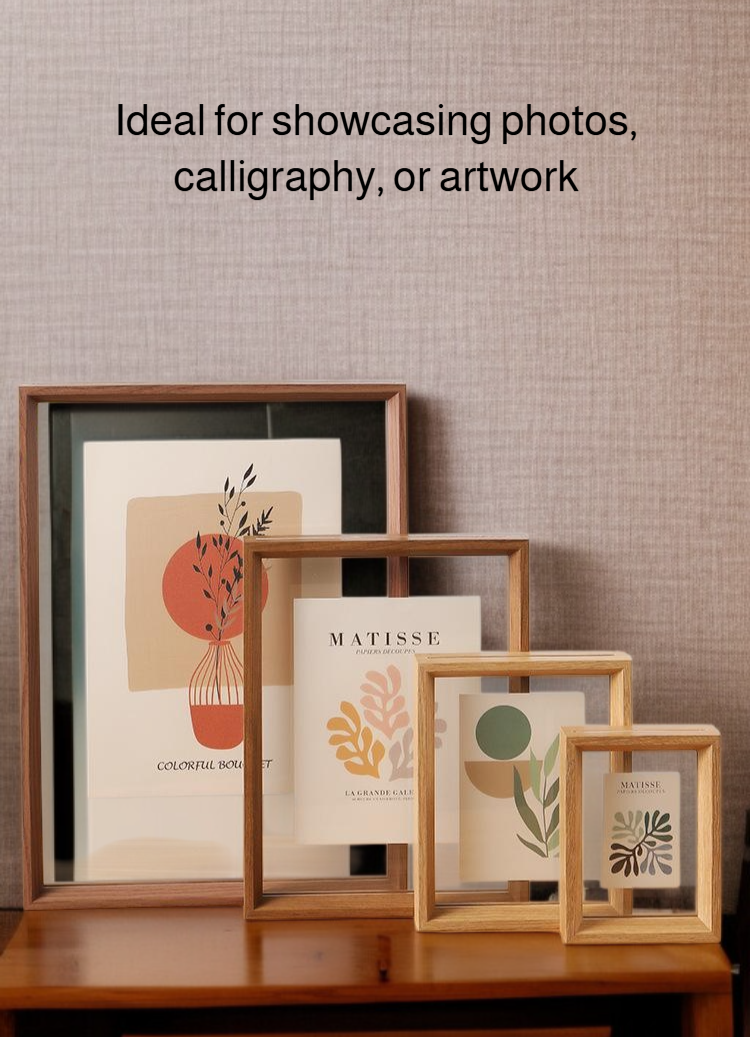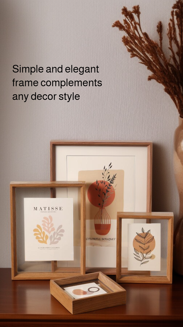 Double-sided transparent acrylic photo frame display stand, showcases photos from both sides, high clarity, durable material, easy to clean, ideal for home or office, modern minimalist design.